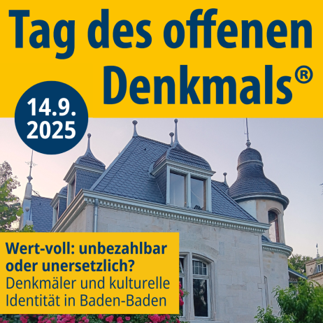 In diesem Jahr findet der bundesweite Tag des offenen Denkmals der Deutschen Stiftung Denkmalschutz am Sonntag 14. September 2025 unter dem Motto „Wert-voll: unbezahlbar oder unersetzlich?“ statt! An diesem Tag schauen Öffentlichkeit, Bevölkerung und Gäste auf die weltberühmten und durch die UNESCO gewürdigten Denkmäler Baden-Badens. Aber auch versteckte Denkmäler in den Ortsteilen sowie private, denkmalgeschützte Häuser öffnen ihre Türen.